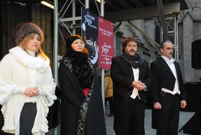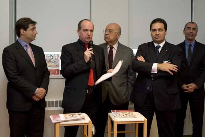 Around 12:30 PM eastern time, the President of RAI Corporation Massimo Magliaro, the General Consul Francesco Maria Talò, the President of Artlivingny Roberto Manzoni and the banker Rocco Zullino, who financed the project, connected live with Milan, sent their greetings and expressed their enthusiasm for the project; at the same time in Milan, there was the inauguration of the Roy Lichtenstein exhibit (Roy Lichtenstein: Meditations on Art, 26 January-30 May 2010). Through a webcam on a big screen the two rooms could see each other and celebrate this future inauguration together.