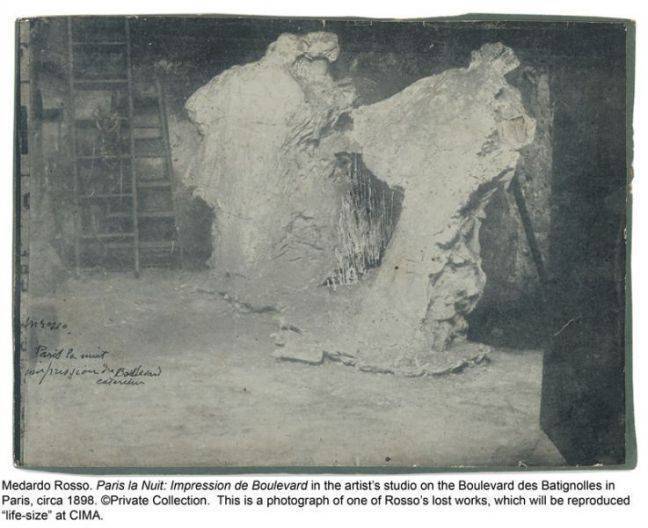 The Museo Rosso then helped sponsor the 2009 publication of Medardo Rosso. Catalogo Ragionato della scultura, published by Skira Editore. Rosso achieved great success and his innovative style won him many imitators. And that meant people were interested in him. We organized exhibits in Europe: of his photography in Berlin in 2006, in Venice in 2007, and at the Boijmans Museum in Rotterdam in February 2014. (Smiling) Now we have finally reached his beloved New York, and CIMA seemed to me to be the best space in which to introduce Americans to Medardo Rosso.