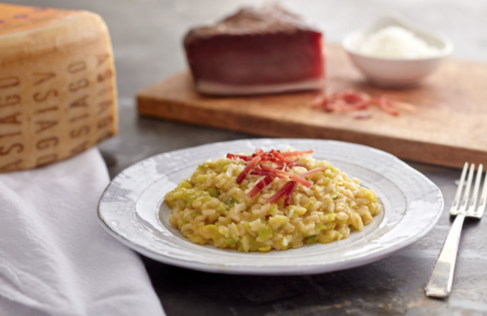 Stir in the leek/butter and the grated Asiago PDO to give the risotto a creamy and velvety consistency.